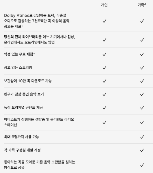 왜 가격차이가 나는지는, 제공하는 서비스의 차이를 보시면 알 수 있습니다. 가족요금제의 경우 최대 6명까지 사용할 수 있고, 각 가족 구성원 개별 계정을 만들 수 있습니다. 또한 좋아하는 곡을 모아둔 기존 음악 보관함을 원하는 방식으로 공유할 수 있어요.