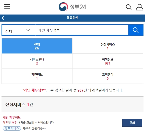 오늘은 정부24 홈페이지에서 확인해볼 수 있는 개인채무 확인방법에 대하여 알아보겠습니다. 해당 사이트에 접속해서 검색창에다가 위의 그림처럼 키워드를 잡고 검색하시면 많은 결과를 볼 수 있습니다. 그중에서 신청서비스는 1건이 나오는데요, 개인별 채무 내역을 조회하는 서비스라고 안내되어 있네요.