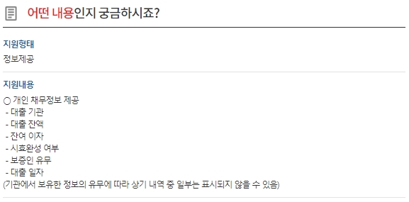 지원형태는 정보제공이고, 지원내용은 개인 채무정보 제공입니다. 여기에는 대출기관, 대출잔액, 잔여이자, 시효완성여부, 보증인유무, 대출일자가 포함되어 있습니다. 다만 기관에서 보유한 정보의 유무에 따라 상기 내역 중 일부가 표시되지 않을 수 있어요.