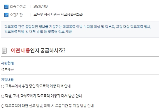 현재시간을 기준으로 최종수정일은 2021년 1월 8일이고, 소관기관은 교육부 학생지원국 학교생활문화과입니다. 지원형태는 정보제공이고 지원내용은 교육부에서 추진중인 학교폭력 예방 대책안내, 학생/교사/학부모에게 학교폭력 예방과 대처방법 안내, 학교폭력에 대한 신고방법 및 피해시 도움기관 등 지원방법 안내입니다.