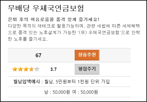 별점은 5점 만점에 3.7점이며, 월납입액예시를 보시면 월납 5만원부터 1천원 단위로 가입이 가능합니다. 여자와 남자 모두 5만원으로 나와있네요.