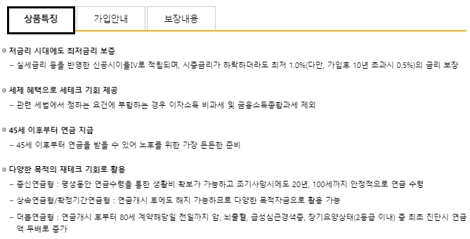 실세금리 등을 반영한 신공시이율4로 적립되며, 시중금리가 하락해도 최저 1.0%의 금리를 보장합니다. 관련 세법에서 정하는 요건에 부합하는 경우 이자소득 비과세 및 금융소득종합과세 제외입니다. 45세 이후부터 연금을 받을 수 있기때문에 노후를 위한 대비를 할 수 있어요. 다양한 목적의 재테크 기회로 활용할 수 있는데요 종신연금형, 상속연금형, 확정기간연금형, 더블연금형이 있으며 각각에 대한 자세한 안내는 위의 내용을 참고할 수 있습니다.