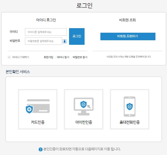 조회 및 신청을 위해서는 로그인을 먼저 해야합니다. 아이디와 비밀번호를 입력하여 접속하거나 [비회원 조회하기] 버튼을 눌러주세요. 비회원의 경우 매번 인증을 진행해야 하며 카드, 아이핀, 휴대전화 인증을 할 수 있습니다. 본인인증이 완료되면 자동으로 다음페이지 이동 후 나머지 과정들을 진행할 수 있습니다.