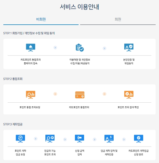 회원의 경우 첫번째 스텝에만 차이가 있는데요, 카드포인트 통합조회 홈페이지에 접속하여 이용약관 및 개인정보 수집/이용/제공동의를 합니다. 본인인증 및 위임동의 후 정보입력을 하여 아이디 로그인을 하시면 되겠습니다. 두번째와 세번째 스텝은 비회원의 경우와 동일하기때문에 생략하겠습니다.