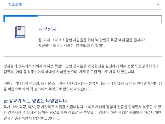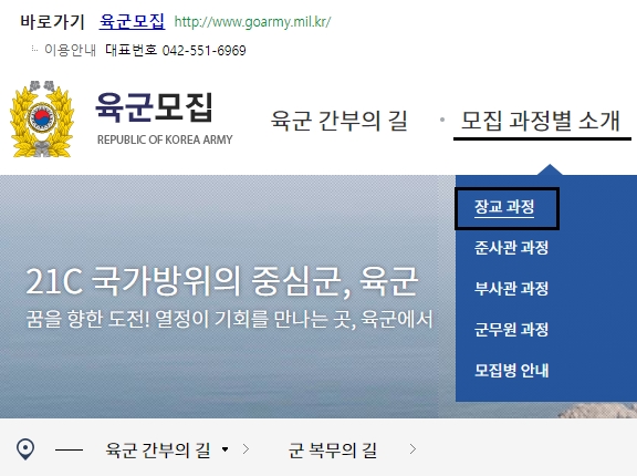 오늘은 육군모집 홈페이지에 접속해서 장교에 지원하는 방법을 알아보려고 하는데요 준사관, 부사관, 군무원에 대한 소개도 볼 수 있습니다. 병사들의 선두에서 지휘해야 하는 책임감이 강한 장교들은 위국헌신을 실천하기 위하여 전문적인 군사지식과 컴퓨터, 어학 등 각종분야의 해박한 지식을 쌓으며 새로운 도전 열기로 가득 차 있습니다.