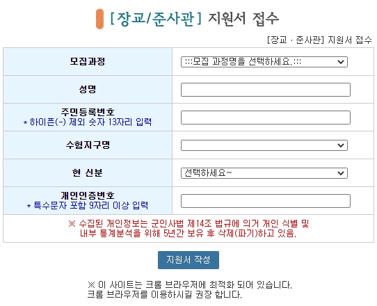장교와 준사관 지원서 접수가 하나로 되어있네요. 모집과정, 성명, 주민등록번호, 수험지구명, 현 신분, 개인인증번호를 입력하고 [지원서 작성] 버튼을 누릅니다. 수집된 개인정보는 군인사법 제14조 법규에 의거하여 개인식별 및 내부 통계분석을 위해서 5년간 보유 후 삭제 및 파기하고 있습니다.