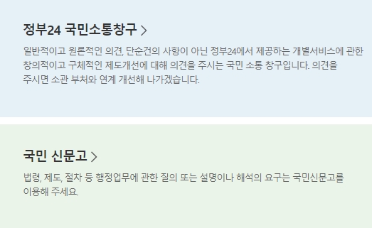 정부24 국민소통창구는 일반적이고 원론적인 의견과 단순건의사항이 아닌 정부24에서 제공하는 개별서비스에 관한 창의적이고 구체적인 제도개선에 대하여 의견을 주시는 국민소통창구입니다. 법령, 제도, 절차 등 행정업무에 관한 질의 또는 설명이나 해석의 요구는 국민신문고를 이용해주세요.