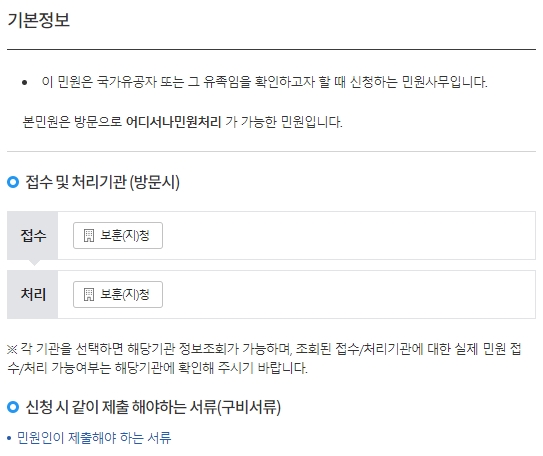 방문시 접수 및 처리기관은 보훈지청 또는 보훈청입니다. 조회된 접수 및 처리기관에 대한 실제 민원접수와 처리가능 여부는 해당기관에 확인해주세요.