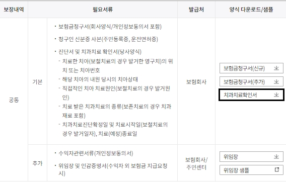 공통서류의 경우 보험금청구서와 청구인 신분증 사본, 진단서 및 치과치료 확인서가 있어야 합니다. 발급처는 보험회사이며, 치과치료확인서는 당사양식을 다운받을 수 있습니다.