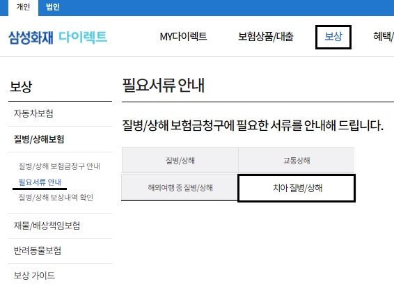 이번시간에는 삼성화재 치과치료확인서 다운받는 방법을 준비해보았는데요, 삼성화재 다이렉트 홈페이지에 접속해서 메인화면 상단에 있는 [보상] 메뉴를 선택하여 [질병/상해보험] 영역의 [필요서류 안내] 항목을 눌러줍니다. 그리고 [치아 질병/상해] 항목을 선택하여 구비서류를 확인하시면 되겠습니다.