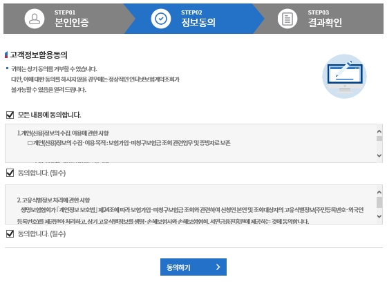 본인인증 후에는 정보동의 단계로 넘어갑니다. 고객정보활용동의를 해야하는데요, 물론 거부를 할수도 있지만 이에 대한 동의를 하지 않을 경우에는 정상적인 인터넷보험계약조회가 불가능할 수 있습니다.