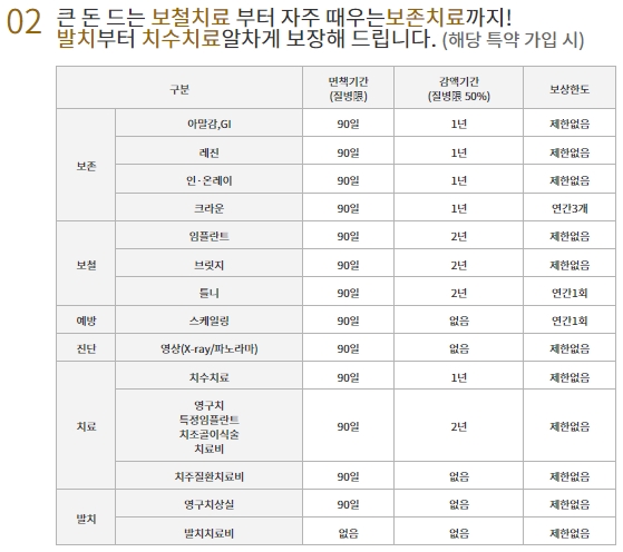 큰 돈 드는 보철치료부터 자주 때우는 보존치료까지 그리고 발치부터 치수치료까지 알차게 보장해줍니다. 보존, 보철, 예방, 진단, 치료, 발치에 대한 면책기간, 감액기간, 보상함도 정보가 나와있으니 위의 표를 참고하시기 바랍니다.