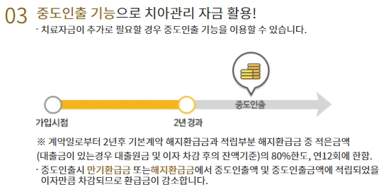 중도인출 기능으로 치아관리 자금을 활용할 수 있는데요, 치료자금이 추가로 필요할 경우 중도인출 기능을 이용할 수 있습니다. 계약일로부터 2년 후 기본계약 해지관급금과 적립부분 해지환급금 중 적은금액의 80%한도이고, 연 12회에 한합니다. 중도인출시 만기환급금 또는 해지환급금에서 중도인출액 및 중도인출금액에 적립되었을 이자만큼 차감되기에 환급금이 감소할 수 있습니다.