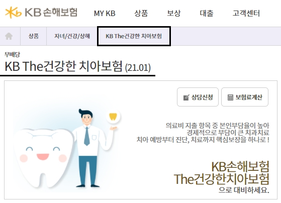 케이비 손해보험 사이트에 접속해서 해당 상품을 찾을 수 있는데요, 상담신청을 하거나 보험료계산을 할 수 있습니다. 의료비 지출 항목 중 본인부담율이 높아서 경제적으로 부담이 큰 치과치료를 할 수 있고, 치아예방부터 진단 및 치료까지 핵심보장을 하나로 묶었습니다.