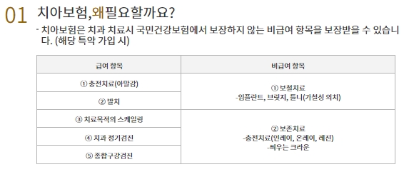 해당특약 가입시, 치아보험은 치과치료시 국민건강보험에서 보장하지 않는 비급여 항목을 보장받을 수 있습니다. 아말감 충전치료와 발치는 급여항목이고