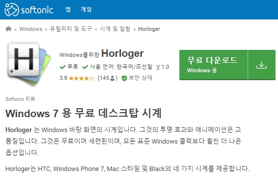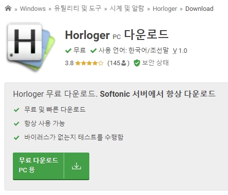 바탕화면에다가 위젯처럼 놓을 수 있는 데스크탑 시계 프로그램을 하나 안내해 드리도록 하겠습니다. horloger x64인데요, 64비트 뿐만아니라 32비트용도 제공하고 있습니다. 해당 소프트웨어를 제공하는 사이트들이 있는데요, 저는 softonic이라는 사이트에 접속해보았습니다.