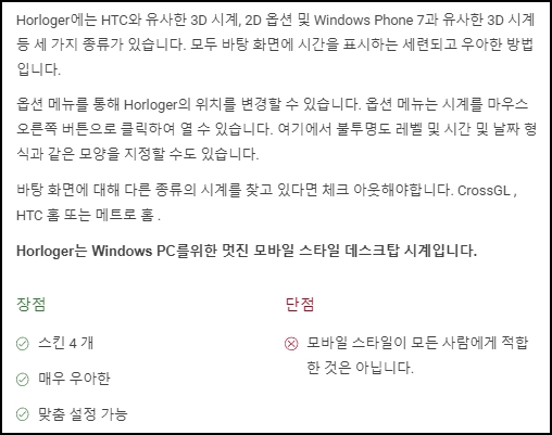Horloger는 윈도우 바탕화면 시계이며, 투명효과와 애니메이션은 고품질입니다. 무료로 이용할 수 있고, 모든 표준 윈도우즈 클럭보다 훨씬 더 나은 옵션입니다. 네가지 시계를 제공하고 [무료 다운로드] 버튼을 눌러서 다운 후 설치하여 실행할 수 있습니다.