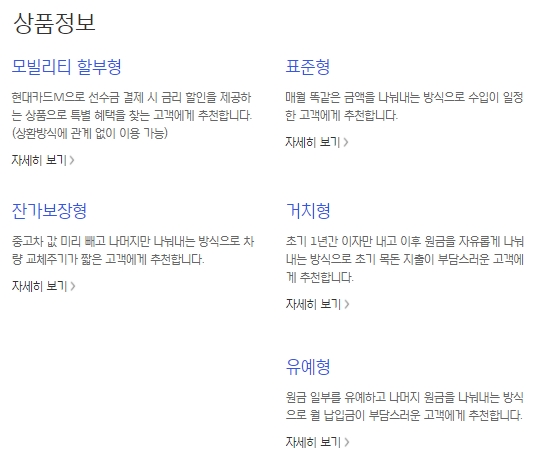상품은 크게 다섯가지로 구분할 수 있습니다. 각각은 모빌리티 할부형, 잔가보장형, 표준형, 거치형, 유예형입니다. 상품마다 특징이 다르기때문에 현재의 여러분들의 상황에서 가장 유리한 상품을 선택하는 것이 좋겠습니다.