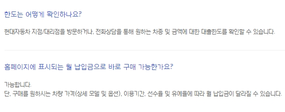 한도확인의 경우 현대자동차 지점 및 대리점을 방문하거나, 전화상담을 통하여 차종 및 금액에 대한 대출한도 확인을 할 수 있습니다. 홈페이지에 표시되는 월납입금으로 바로 구매가 가능하며 구매를 원하는 차량가격, 이용기간, 선수율, 유예율에 따라서 월납입금이 달라질 수 있습니다.