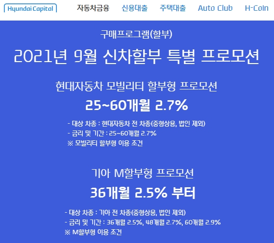 현대캐피탈 홈페이지에 접속하시면 신차할부 프로모션을 확인할 수 있습니다. 현대자동차 모빌리티 할부형 프로모션으로 25~60개월까지 2.7%의 금리로 이용할 수 있고,