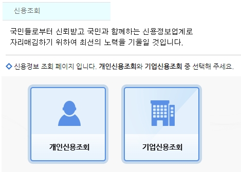 기술신용 평가업무는 기업 및 법인인 신용정보주체의 신용상태 및 기술에 관한 가치를 평가하여 기술신용정보를 생성한다음 해당 신용정보주체 및 그 신용정보주체의 거래상대방 등 이해관계를 가지는 자에게 제공하는 행위입니다. 신용정보 조회 페이지에서는 개인신용조회와 기업신용조회 중 선택할 수 있습니다.