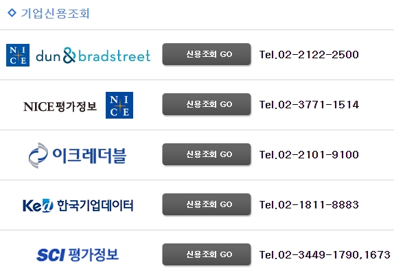 기업신용조회는 던앤브래드스트리트, 나이스평가정보, 이크레더블, 한국기업데이터, SCI평가정보를 통하여 할 수 있고 조회페이지로 이동하거나 전화번호 정보를 확인할 수 있습니다.