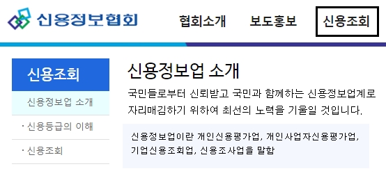 이번시간에는 신용정보협회 사이트에 접속해서 기업신용정보 조회하는 방법을 알아보겠습니다. 해당 홈페이지 주소는 네이버나 다음 또는 구글 등을 활용하여 검색하시면 바로가기를 쉽게 통할 수 있습니다. 홈화면 상단에 있는 [신용조회] 메뉴를 선택하고 [신용정보업 소개] 페이지부터 보겠습니다.