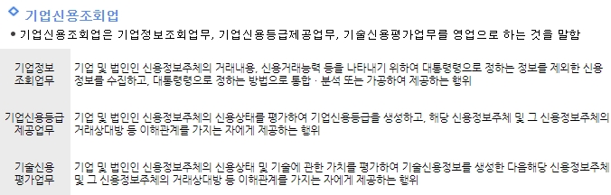 국민들로부터 신뢰받고 국민과 함께하는 신용정보업계로 자리매김하기 위하여 최선의 노력을 기울일 것이라고 하는데요 신용정보업이란 개인신용평가업, 개인사업자신용평가업, 기업신용조회업, 신용조사업을 말합니다. 기업신용조회업은 기업정보조회업무, 기업신용등급제공업무, 기술신용평가업무를 영업으로 하는것을 말하며, 각각에 대한 상세안내는 아래와 같습니다.