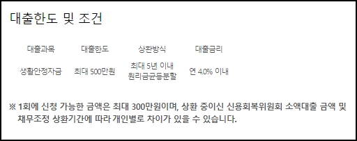 대출과목은 생활안정자금이고, 한도는 최대 500만원까지입니다. 상환은 최대 5년 이내이며, 원리금균등분할상환으로 합니다. 금리는 연 4.0%이내이고, 1회에 신청이 가능한 금액은 최대 300만원입니다. 또한 상환중인 신용회복위원회 소액대출 금액이나 채무조정 상환기간에 따라서 개인별로 차이가 발생할 수 있어요.