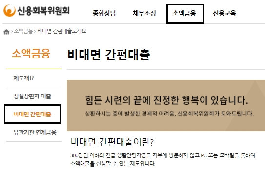 상환하는 중에 발생하는 경제적인 어려움에 대하여 신용회복위원회가 도와드리겠다는 문구가 있네요. 300만원 이하의 긴급 생활안정자금을 지부에 방문하지 않고 PC나 모바일을 통하여 소액대출을 신청할 수 있습니다.