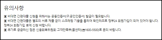비대면 간편대출 신청을 위하여 공동인증서 발급이 필요하고, 별도의 서류제출 없이 스크래핑 기술을 통하여 확인하기에 정부24 회원가입이 되어있어야 합니다. 추가로 궁금한 사항이 있으시면 신용회복위원회 고객만족부 및 콜센터로 문의해주시기 바랍니다.