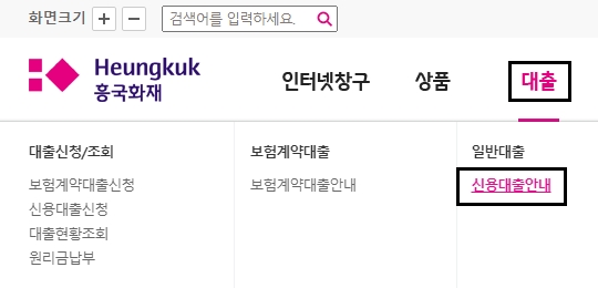 보험사에서도 해당 상품을 제공하는 경우가 있는데요, 이번시간에는 흥국화재 신용대출 상품에 대해서 알아보겠습니다. 메인화면 상단에 있는 [대출] 메뉴를 선택하고 [일반대출] 영역에 있는 [신용대출안내] 항목을 눌러줍니다.