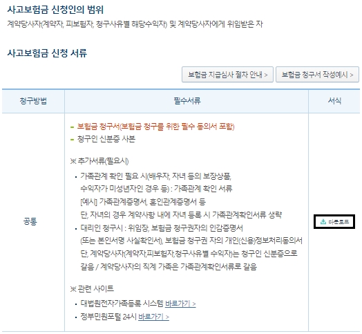 사고보험금 신청인의 범위는 계약당사자 및 계약당사자에게 위임받은자이며, 신청서류는 공통적으로 보험금 청구서와 청구인 신분증 사본이 필요합니다. 서식영역에서 [다운로드] 버튼을 누르시면 다운 후 문서를 열 수 있습니다. 가족관계 확인이 필요하거나 대리인이 청구하는 경우에는 추가서류가 필요할 수 있으니 위의 표 내용을 참고하세요.