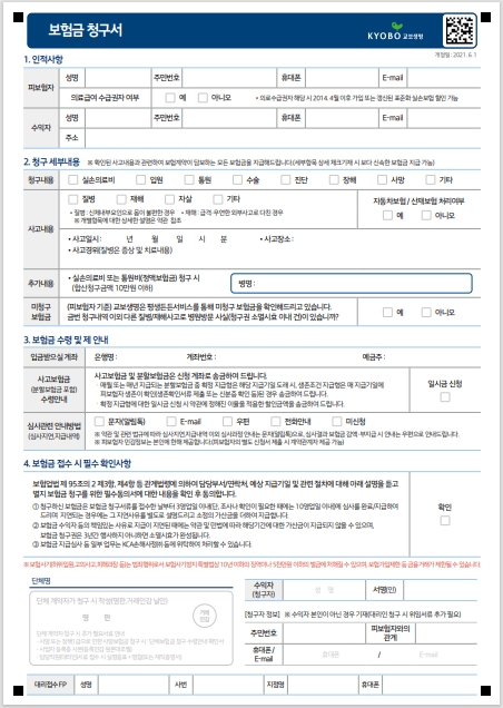 보험금 청구서를 다운받아서 문서를 열면 위의 그림과 같은 페이지를 볼 수 있습니다. 여러장으로 구성되어 있는데 그중에서 가장 첫번째 장을 열어보았습니다. 인적사항, 청구 세부내용, 보험금 수령 및 제 안내, 보험금 접수시 필수 확인사항이 안내되어 있네요.