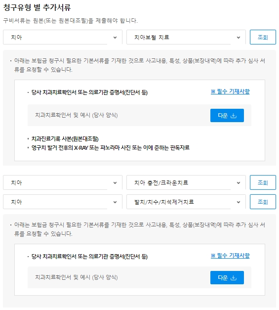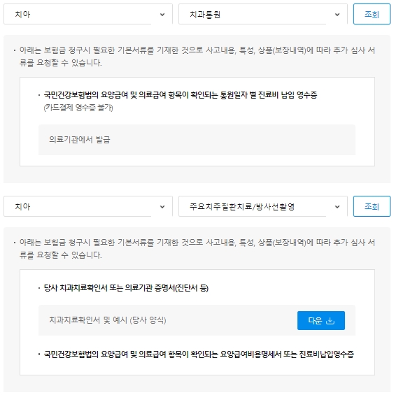 치아보철치료는 당사의 치과치료확인서 또는 의료기관 증명서, 치과진료기록 사본, 영구치 발거 전후의 엑스레이 또는 파노라마 사진 또는 이에 준하는 판독자료가 있어야 합니다. 치아충전이나 크라운치료, 발치/치수/치석제거치료의 경우 당사 치과치료확인서 또는 의료기관 증명서가 있으면 됩니다.