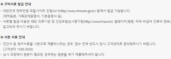 구비서류는 민원24 등에서 발급할 수 있고, 서류별 발급비용은 해당 의료기관 및 건강보험심사평가원 홈페이지를 참고하시면 됩니다. 진단서 등 청구서류를 사본으로 제출하려는 경우, 접수전 반드시 당사 고객센터로 문의하시기 바라며, 심사과정에서 원본이 필요한 경우에는 원본을 추가로 제출해야 합니다.