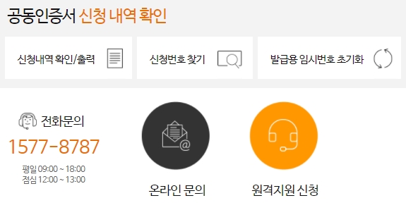 공동인증서 신청내역 확인과 관련해서는 확인과 출력, 신청번호 찾기, 발급용 임시번호 초기화를 하실 수 있습니다. 더 궁금한 사항이 있으시면 고객센터로 연락하시거나 온라인문의 및 원격지원 신청을 할 수 있어요. 전화문의 가능시간은 평일 09시~18시까지이고, 점심시간은 12시~13시까지입니다.
