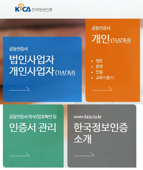 홈페이지 메인화면을 보시면 네가지 메뉴가 있는데요 각각은 법인사업자와 개인사업자 공동인증서, 개인 공동인증서, 복사와 암호확인 등 인증서관리, 한국정보인증소개입니다. 저는 개인 공동인증서를 기준으로 신청 및 신청내역 확인하는 방법을 살펴보겠습니다.