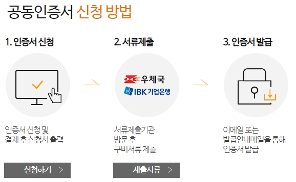 다음은 신청방법을 보겠습니다. 인증서신청 및 결제후 신청서 출력을 하고, 서류제출기관 방문후 구비서류를 제출합니다. 최종적으로 이메일 또는 발급안내메일을 통하여 인증서를 발급받으면 되겠습니다.