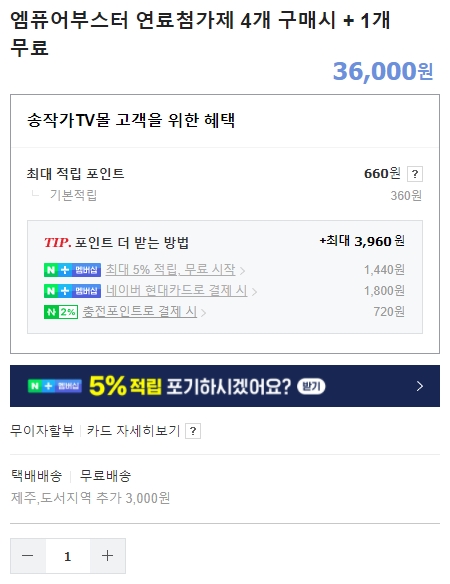 엠퓨어부스터 연료첨가제를 선택해보았으며, 4개를 구매하면 1개를 무료로 증정하는 행사를 진행하고 있습니다. 저같은 경우에는 지금까지 연료첨가제를 한번도 써본적은 없지만, 효과가 있다고 하는분들도 있기때문에 주기적으로 구매하시기도 합니다. 아무튼 이런식으로 송작가 쇼핑몰에서 인기상품을 확인할 수 있으니, 여러분들도 필요한 물품이 있으면 잘 따져보고 구매해보시기 바랍니다.