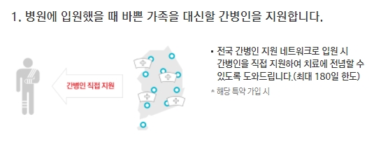 그럼 각 항목에 대한 자세한 설명을 보겠습니다. 먼저 병원에 입원했을때 바쁜 가족을 대신할 간병인을 지원합니다. 해당특약 가입시 전국 간병인 지원 네트워크로,