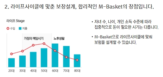 라이프사이클에 맞춘 보장설계를 제공하는데요 자녀수, 나이, 개인소득수준에 따라 집중적으로 돈이 필요한 시기가 다를 수 있습니다. 그에따라 M-Basket으로 라이프사이클에 맞춰서 보험설계를 할 수 있습니다.