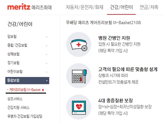 무배당 메리츠 케어프리보험 M-Basket2108 상품에 대하여 알아보도록 하겠습니다. 메리츠화재 홈페이지에 접속해서 [건강/어린이] 카테고리를 선택하고 [통합보험] 영역에 있는 [케어프리보험 M-Basket] 항목을 선택하시면 됩니다.