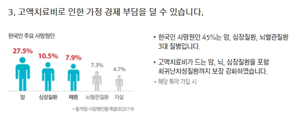고액치료비로 인한 가정경제 부담을 덜 수 있는데요, 한국인 사망원인의 45%는 암과 심장질환 그리고 뇌혈관질환 이렇게 3대 질병이라고 합니다. 해당특약 가입시 고액치료비가 드는 암, 뇌, 심장질환을 포함하여 희귀난치성질환까지 보장을 강화했습니다.