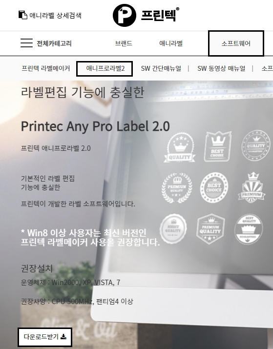 프린텍에 접속해서 다운받을 수 있는 애니프로라벨2 소프트웨어에 대한 소개와, 애니라벨 다운로드하는 방법에 대해서 알아보겠습니다. 사이트 주소는 웹이나 인터넷검색 등을 활용하여 바로가기를 통할 수 있으며, 메인화면 상단에 있는 [소프트웨어] 메뉴를 눌러주시면 됩니다.