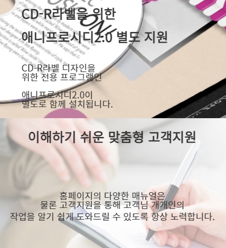CD-R 라벨을 위한 전용 프로그램인 애니프로시디 2.0이 별도로 함께 설치되며, 홈페이지의 다양한 매뉴얼은 물론이고 고객지원을 통하여 고객 개객인의 작업을 알기쉽게 도와드릴 수 있도록 항상 노력하고 있습니다.