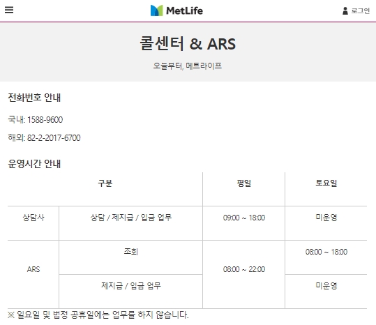 MetLife 또는 메트라이프생명 고객센터 그리고 ARS에 대한 안내를 드리겠습니다. 전화번호는 국내와 해외로 구분되어 있으며, 아래의 그림을 참고하시면 됩니다. 운영시간은 상담사의 경우 평일 09시~18시까지이고, ARS 조회업무는 평일 09시~22시 및 토요일 08시~18시까지입니다. ARS 제지급/입금업무는 평일 08시~22시까지 운영합니다.