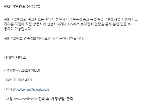 ARS 비밀번호와 계좌번호는 계약자 본인이 주민등록증과 등록할 은행통장을 지참하여 가까운 지점에 직접 방문하셔서 신청하시거나, ARS에서 휴대전화 인증을 통하여 본인인증 후 등록이 가능합니다. 비밀번호가 연속으로 5회 이상 오류나면 이용이 제한됩니다. 장애인 서비스에서는 전용번호, 팩스, 이메일, 채팅을 통하여 연락할 수 있어요.