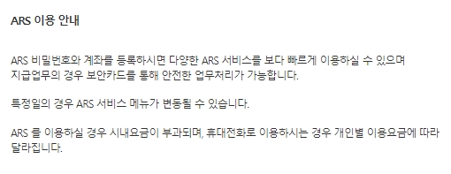 ARS 비밀번호와 계좌를 등록하시면 다양한 ARS 서비스를 보다 빠르게 이용할 수 있고, 지급업무의 경우 보안카드를 통하여 안전한 업무처리를 할 수 있습니다. 특정일의 경우 ARS 서비스 메뉴가 변동될 수 있으며, ARS 이용시 시내요금이 부과되고 휴대폰으로 이용하는 경우 개인별 요금제에 따라서 부과되는 비용이 달라질 수 있습니다.
