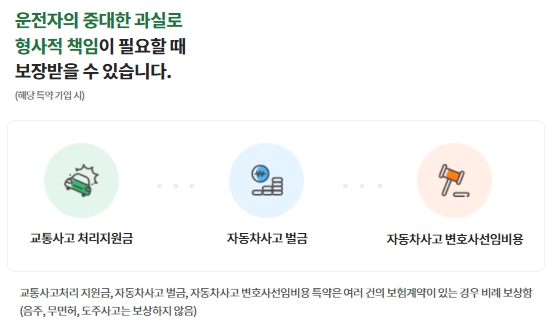 관심상품으로 담거나 SNS에 공유할 수 있어요. 해당특약 가입시 운전자의 중대한 과실로 형사적 책임이 필요할때 보장받을 수 있으며, 교통사고 처리지원금과 자동차사고 벌금 및
